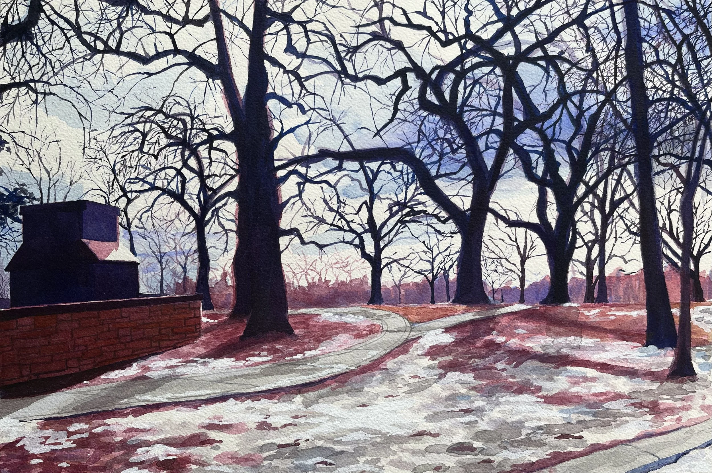 “Wash Park Winter Trees”, 16”x12”, watercolor and acrylic ink on paper, PRINTS HERE!