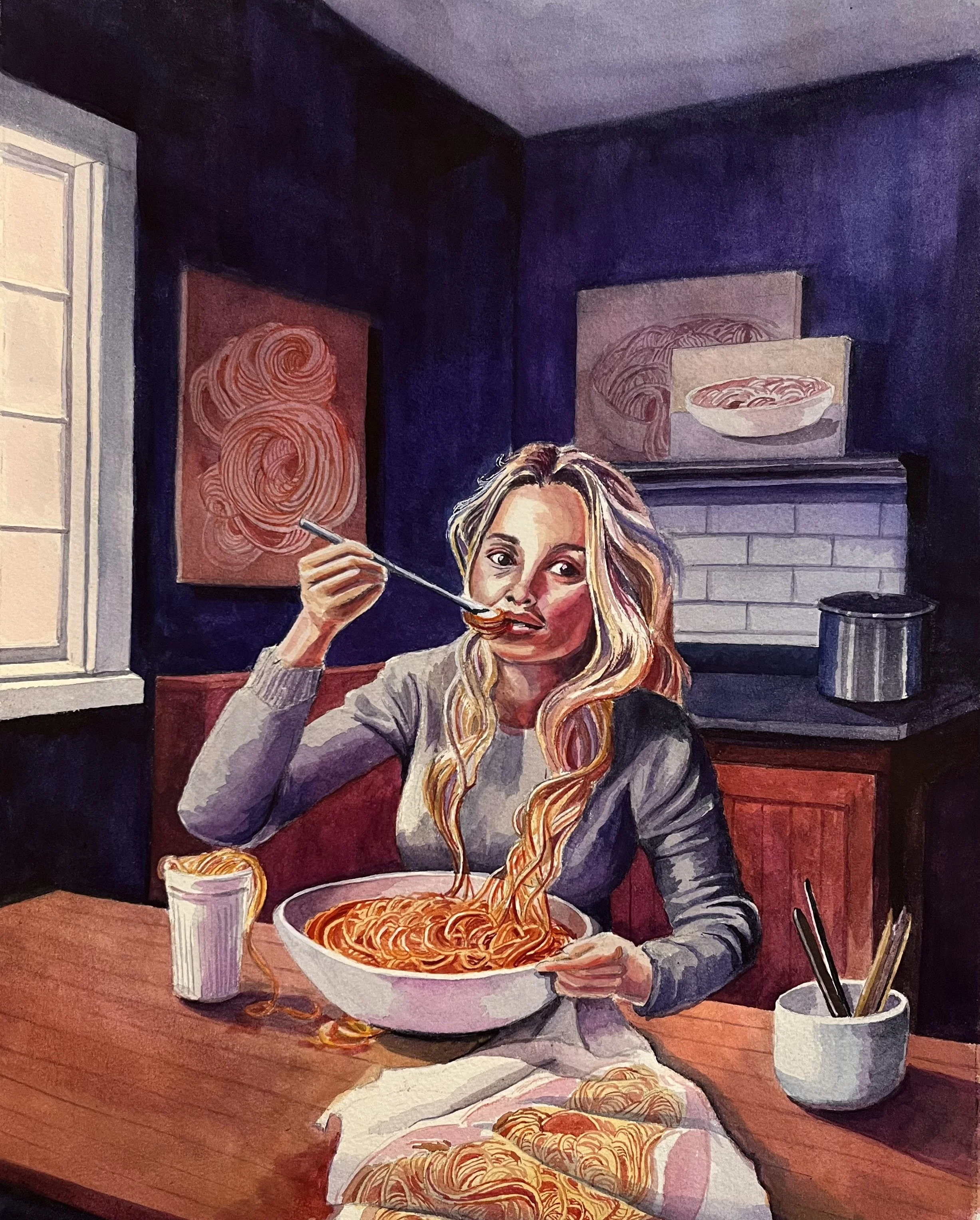 “Drowning in Birthday Cakes”, 9”x12”, watercolor and acrylic ink on paper, PRINTS HERE!